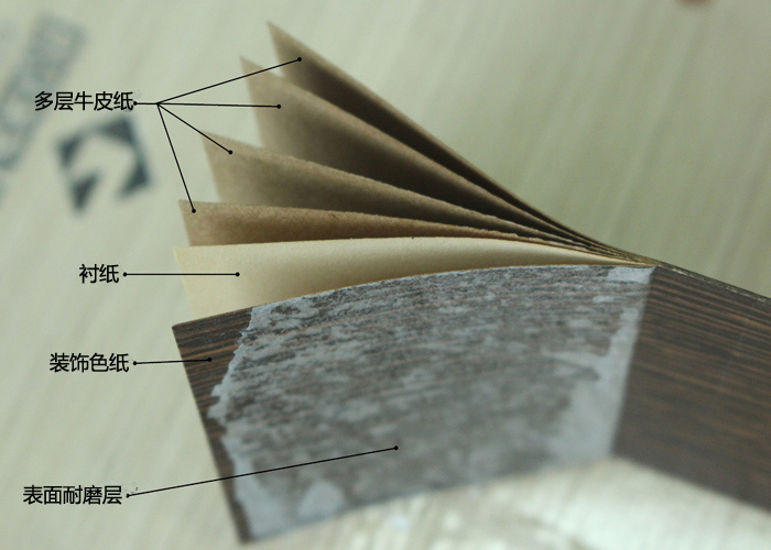 装饰防火板表面是有一层特殊材料的耐磨层,表面耐磨 ≥350转 700转这么一个参数可以参考,往里是色纸,可以自由选择,根据装修风格而定;之后就是牛皮纸,经过含浸三聚氰胺和酚醛树脂等经过高温高压制成。